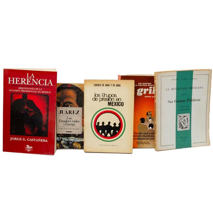 Subasta 1205T, Lote # 149 Libros sobre Historia de México. Títulos: -Silva Herzog, Jesús. Breve Historia de la Revolución Mexicana. -Fuentes Mares, José. Las Mil y una Noches Mexicanas. -Martínez, José Luis. Nezahualcóyotl. -Castillo, Heberto. Historia de la Revolución Mexicana. -Lozano Fuentes, José Manuel. Historia del México Contemporáneo. -Guerra Leal, Mario. Los sotanos de la política mexicana "la grilla": -Castañeda, Jorge G. La Herencia Arqueología de la Sucesión Presidencial en México. -Pensamiento y Acción de Francisco I. Madero. -La Revolución Mexicana sus causas políticas. -Aguilar Camin, Héctor. Saldos de la Revolución. -Ricardo Flores Magón el apostol cautivo. -Aguilar Camín, Héctor. A la sombra de la Revolución Mexicana. -Olloqui, Juan de. México Fuera de México. -Quirarte, Martín Visión Panoramica de la Historia de México. Encuadernados en rústica y pasta dura. Total de piezas: 65. Estimado $1,000-2,000