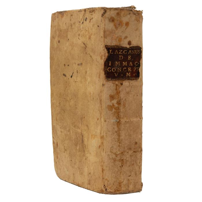 Lazcano, Francisco Xaviero. Opusculum Theophilosophicum de Principatu, seu Antelatione Marianae Gratiae Illud, S. Joannis Damasceni Oratione Prima de Nativitate Virginis Maria circa Principium Explanans Essatum. Venetiis: Ex Typographia Andrae Poletti, 1755. 16o. marquilla, XLVII + 571 p. Mancha de humedad en margen interno de tercio superior. Encuadernado en pergamino. Estimado $3,000-4,000