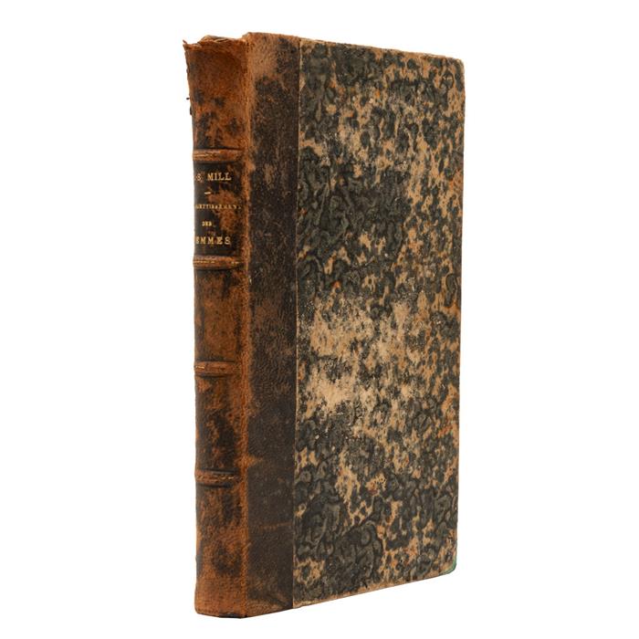 Mill, John Stuart. L'Assujettissement des Femmes. Paris: Guillaumin et Cie., Éditeurs, 1876. 8o. marquilla, 248 p. Traduit de l'anglais par E. Cazelles. Deuxième édition. Página uno pérdida de papel en márgenes, no afecta texto; de portada a página 5 con manchas de óxido. Encuadernado en pasta dura, lomo en piel. Estimado $2,000-3,000