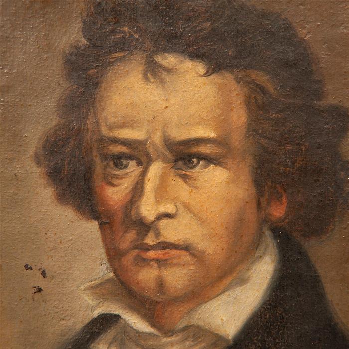 Subasta 1205T, Lote # 84 ANÓNIMO (Siglo XX) Ludwig van Beethoven Sin firma Óleo sobre madera Enmarcado. 19 x 14 cm Estimado $2,500-5,000
