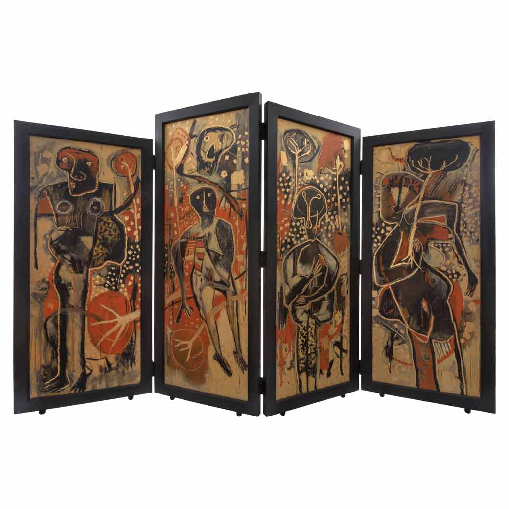 Subasta 1134, Lote # 118 ALEJANDRO SANTIAGO (Teococuilco de Marcos Pérez, Oaxaca, 1964 - Oaxaca, Oaxaca, 2013) Biombo II Firmado y fechado 2002 Óleo y hoja de oro sobre madera, biombo unido por bisagras, doble vista a)168 x 69 cm b)160 x 69 cm c)170 x 69 cm d)154 x 69 cm 172 x 278 cm medidas totales Procedencia: colección privada, Londres, Inglaterra; colección privada, México. Presenta detalles de conservación. Alejandro Santiago se formó de la mano de algunos de los pilares artísticos de México, fue integrante de la primera generación del Taller de Artes Plásticas Rufino Tamayo, donde conoció a dicho artista, ahí mismo entabló relación con Francisco Toledo y Rodolfo Nieto. Otro de sus maestros y quien también influenció su línea de producción fue Shinzaburo Takeda. Su obra derivó del acercamiento a múltiples expresiones artísticas, entre ellas las que tuvo oportunidad de experimentar en Estados Unidos, donde acudió como seleccionado de un intercambio cultural. Ahí conoció la obra de Antonio Saura y Jean-Michel Basquiat cuyos estilos podemos apreciar en su obra mezclados con su arraigado origen zapoteca. A lo largo desu producción encontramos también algunas reflexiones entorno a la vida, la muerte, el ser y el renacer plasmados en diversos medios en los que destaca la mezcla de texturas con una paleta cromática que puede variar desde los ocres areniscos hasta los tonos cálidos. Fuentes consultadas: ARANDA MÁRQUEZ, Carlos et al. Oaxaca tierra de arte. Venecia. Mondadori Electa, 2003, pág. 60 y "Se cumplen tres años de la muerte del pintor Alejandro Santiago". México. 20 minutos Notimex, sección Artes, 21 de julio de 2016. Estimado $1,500,000-2,500,000