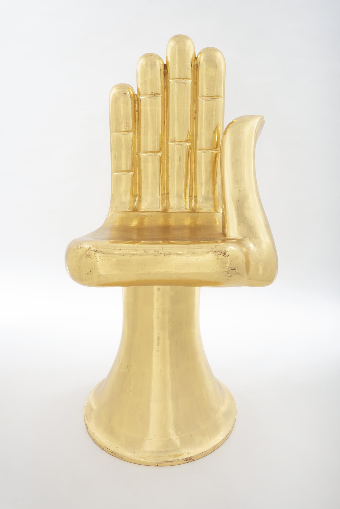 Subasta 1134, Lote # 88 PEDRO FRIEDEBERG (Florencia, Italia, 1936 - ) Mano - silla Firmada en la base Escultura en madera tallada y hoja de oro Con certificado de autenticidad del artista, noviembre de 2022. Presenta ligeros detalles de conservación La obra de Pedro Friedeberg abarca diversos medios, lo que refuerza su papel como uno de los artistas más importantes de la escena actual, además de ser el reflejo de años de experimentación propia y de sus colegas durante el siglo XX. Su estilo se ha denominado como surrealista o incluso psicodélico, ya que se aleja de los cánones tradicionales del diseño, con decoraciones repetitivas, obsesivamente geométricas y de alto contenido simbólico, tal es el caso de sus muebles, los cuales pertenecen a un mundo fantástico, donde se fusionan extremidades humanas o no humanas en arquitecturas hipnotizantes. Fuente consultada: SÁNCHEZ, Luis Carlos. "Pedro Friedeberg, diseñador". México, Excélsior, 19 de mayo de 2016. Derechos Reservados © Pedro Friedeberg 95 x 52 x 52 cm Estimado $200,000-350,000