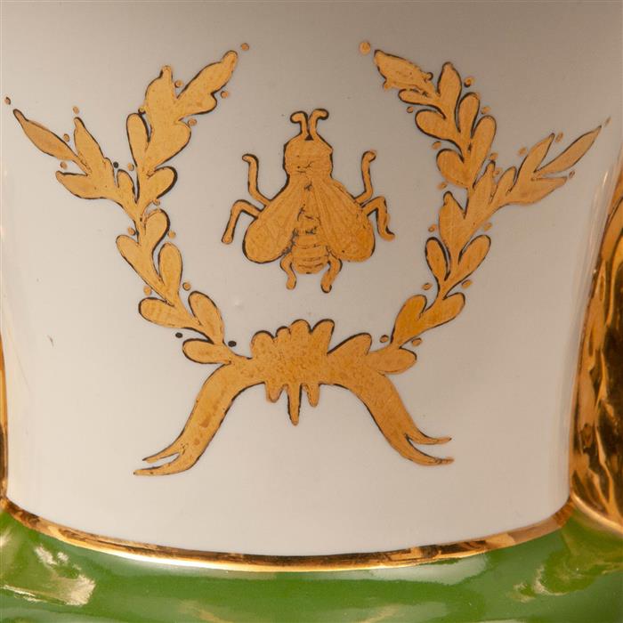 Decorada con escudo, cenefas verdes y esmalte dorado