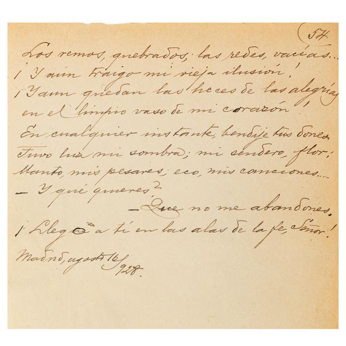 Subasta 0051L, Lote # 273 Urbina, Luis G. El Cancionero de la Noche Serena. Manuscrito. Sevilla: 1929. Manuscrito. 8o. marquilla, 54 folios. "Un amigo mio, que ejerce sobre mi, la doble influencia de su talento y de su corazón, me pone en el trance de qubrantar un proposito: el de permanecer en silencio y al margen de la actual corriente literaria. Mi amigo se ha empeñado en que publique yo un libro de versos. Cedo a sus insinuaciones, como quien, rendido por el halago, cae en la tentación...". Manuscrito inédito. Carpeta en pergamino, con el título en color. Con el mismo título se publicó: "Urbina, Luis. El Cancionero de la Noche Serena. México: Imprenta Universitaria, 1941. Primera edición. 124 p. La edición consta de Doscientos Cincuenta ejemplares numerados del 1 al 250.". Estimado $7,000-9,000