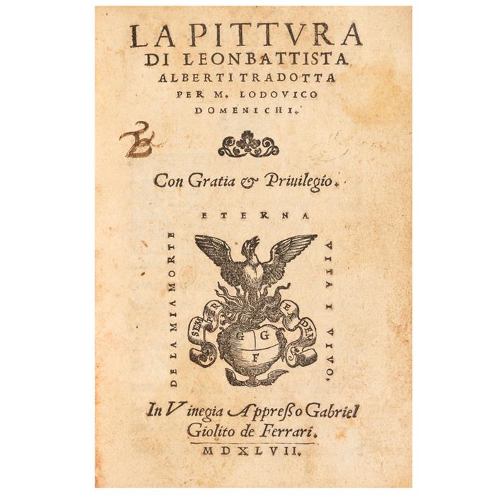 Subasta 0051L, Lote # 345 Dolce, Lodovico / Battista Alberti, Leo. Dialogo della Pittura / La Pittura. a) Dolce, Lodovico. Dialogo della Pittura. Vinegia: Apresso Gabriel Ciolito de Ferrari, 1557. 16o. marquilla, 60 folios. Nel quale si ragiona della dignita di assa Pittura, e di tutte le parti necessarie, che a persetto Pittore si acconuengono: con esempi di pittori antichi, & moderni: e nel fine si sa mentione delle uirtu e delle opere del Divin Titiano. b) Battista Alberti, Leo. La Pittura. Vinegia: Apresso Gabriel Giolito de Ferrari, 1647. 16o. marquilla, 44 folios. Dos obras en un volumen. Encuadernado en pergamino. Estimado $22,000-25,000