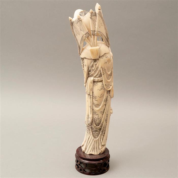 Talla en marfil, decoración esgrafiada, tinta negra; con base de madera