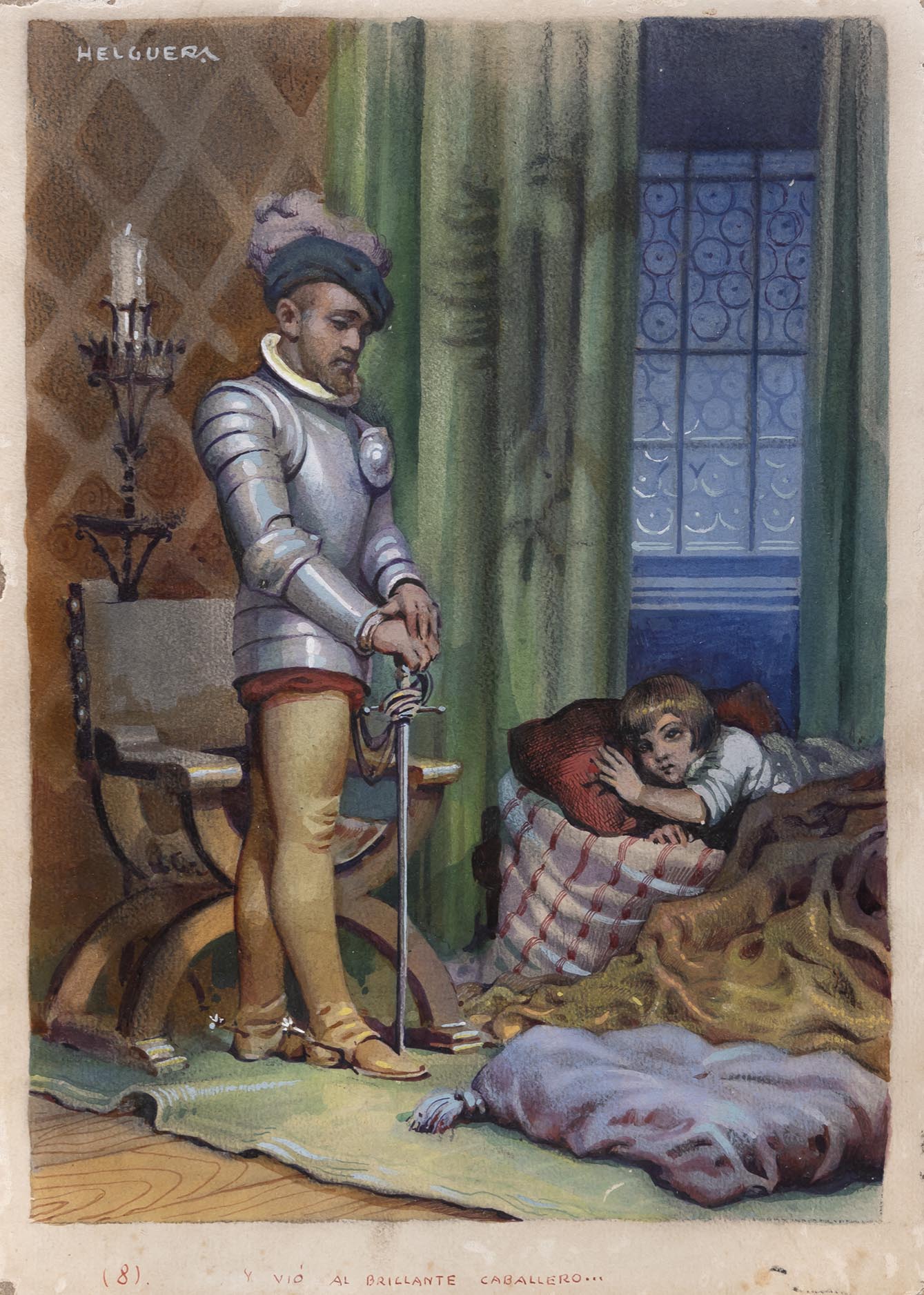 Subasta 1134, Lote # 22 JESÚS HELGUERA (Chihuahua, México, 1910 - Ciudad de México, 1971) a) Cofre, Y vio al brillante caballero… b) Capítulo I, El Rey dio la espada de Condestable de Castilla a Don Álvaro de Lima c) Capítulo IV, Ordenó que tomasen a aquel hombre malvado y perverso y le arrojasen de las barandas de la torre d) Capítulo Firmadas Acuarela, gouache, tinta y lápiz de grafito sobre papel sobre cartón Piezas: 6 Con sellos de Schutzmarke - Schoellershammer y de Biblioteca y Archivo Álvaro de la Helguera, padre de Jesús Helguera. c) Publicado en: DE LA HELGUERA, Álvaro. Los grandes hechos de los grandes hombres. Gutenberg. Barcelona, España, Editorial Araluce, 1963, portada. Presentan detalles de conservación. Jesús Helguera fue uno de los artistas responsables detrás de la producción de una cantidad considerable de imágenes que conforman el bagaje popular mexicano. Si bien su obra relacionada con el arte calendárico es reconocida, su carrera abarca un extenso camino previo a ello. Cuando apenas era un infante, su familia decidió migrar a España, desde aquel momento hizo saber su inclinación artística y sin sospecharlo los temas históricos y paisajes estuvieron presentes desde un inicio en su obra. A la edad de 18 años ya estaba laborando como ilustrador de cuentos infantiles en la Editorial Araluce, donde se publicaron un sinnúmero de libros en los que su obra ilustraba relatos tradicionales de todo el mundo, así como pasajes de cultura general. Fuente consultada: ESPINOSA, Elia. Jesús Helguera y su pintura, una reflexión. México. Universidad Nacional Autónoma de México - Instituto de Investigaciones Estéticas - 2004, pp. 23-46. 30 x 22 cm cada una Estimado $50,000-70,000