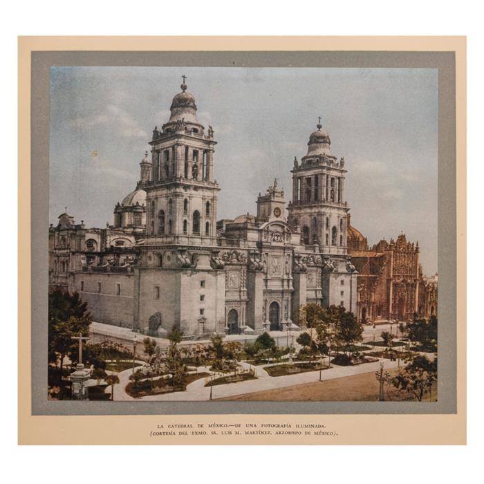 Subasta 0051L, Lote # 377 Toussaint, Manuel. La Catedral de México y el Sagrario Metropolitano. Su Historia, Su Tesoro, Su Arte. México: Comisión Diocesana de Orden y Decoro, 1948. fo. doble marquilla, XXXVIII + 377 p. Primera Edición. Ilustrado con 91 figuras en negro y 20 en color. Autor del texto y director de la edición: Manuel Toussaint. Fotografías en negro: Luis Márquez, José Lladó y Guillermo Kahlo. Fotografías en color: Berthold von Stetten. Planos y relevamientos: Dirección de Bienes Nacionales y Escuela de Arquitectura. Dibujante: Tomás Montero Torres. Se han impreso mil cien ejemplares de esta obra... numerados del 1 al 1,100. Terminado el tiro fueron destruidos los clisés. Ejemplar No. 427. Colofón: "… El dibujante Montero sólo realizó las guardas y tres capitulares; las demás, así como los remates son obra de David G. Bueno. Llevó a cabo la encuadernación Mario Castilleja y el escudo y broches de plata, fueron trabajados en Puebla, por los artífices López.". Ejemplar muy descuidado. Pasta anterior desprendida, reforzada en gracia. Encuadernado en pasta dura, en piel con escudo y broches en plata. Estimado $4,000-6,000