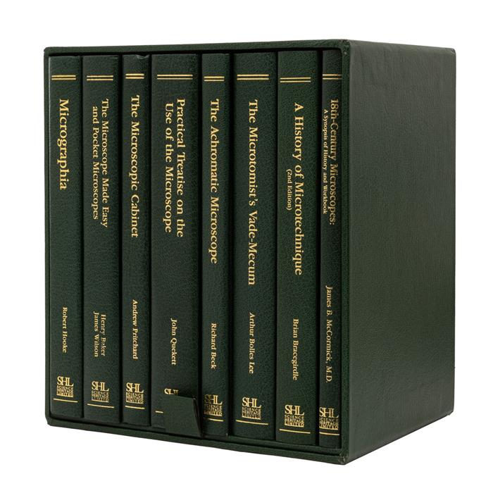 4o. Facsimilares. Nueve títulos en 8 volúmenes: Robert Hooke: Micrographia (1665); Henry Baker: The Microscope Made Easy (1969) junto a James Wilson: Pocket Microscopes (1706); Andrew Pritchard: The Microscopic Cabinet (1832); John Quekett: Practical Treatise on the Use of the Microscope (1848); Richard Beck: The Achromatic Microscope (1865); Arthur Bolles Lee: The Microtomist's Vade-Mecum (1885); Brian Bracegirdle: A History of Microtechnique, segunda edición (1987) y James B. McCormick: 18th-Centruy Microscopes: A Synopsis of History and Workbook (1987). Encuadernados en pasta dura, en estuche.