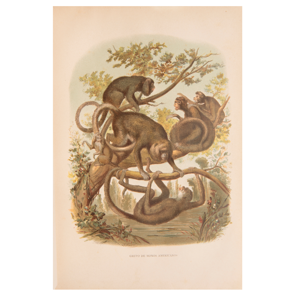 Subasta 0051L, Lote # 178 A. E. BREHM LA CREACIÓN. HISTORIA NATURAL BARCELONA: MONTANER Y SIMÓN, EDITORES, 1880 - 1883 4o. marquilla, XVIII + 534; 692; XXII + 590; 576; X + 574; XIV + 392 + 308; 756; 588 p. Tomos I - IX (Tomos VI y VII en un volumen). División de la Obra Zoología o Reino Animal, Antropología, Botánica, Mineralogía, Geología y Paleontología, escritas por eruditos autores españoles con presencia de los más completos y recientes datos de estas diferentes ramas de la ciencia. Ilustrados con cromolitografías e ilustraciones intercaladas en el texto. Tomo I: 10 cromolitografías. Sin portada; de guarda a página 30 desprendidas; pasta anterior y lomo desprendidos. Tomo II: 4 cromolitografías. Páginas 291 - 294, 395 - 397 y dos láminas por desprenderse; media caña roída. Tomo III: 8 cromolitografías. Tomo IV: 3 cromolitografías. Tomo V: 13 cromolitografías. Tomo VI - VII: 8 + 4 cromolitografías. Tomo VIII: 9 cromolitografías. Lámina y página 399 desprendidas. Tomo IX: 4 cromolitografías. Un mapa "Mapa Geológico de la Península Ibérica" y un Plano, ambos a doble página. Lomos y pastas deteriorados; T. IV sin lomo, T. V falta tercio inferior de lomo; T. 9 falta tercio superior de lomo Encuadernados en pasta dura, lomo y puntas en piel Piezas: 8 Estimado $1,500-2,000