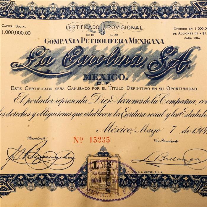 Subasta 1228T, Lote # 167 Lote de Acciones. Títulos: -Compañía Petrolifera Mexicana. "La Carolina". Números 15230, 15233, 15235. Capital Social $1.000,000.00. México, 1914. Piezas: 3. -"La Nacional". Compañía Mexicana de Petroleo. Bonos números 62045, 62250, 32242. Serie A. Valor $10.00. Capital Social $5.000.000. San Luis Potosi, 1916. Piezas: 3. -Compañía de Petroleo Inglesa y Anexas. Títulos números 31846, 31848, 31847. Capital Social $6,000.000. México, 1916. Cupones completos. Piezas: 3. -Compañía Petrolera "El Centauro". Títulos números 15234, 15233, 15232. Serie "A". Capital Social $3.500.000. México, 1916. Cupones completos. Total de piezas: 12. Estimado $2,000-3,000