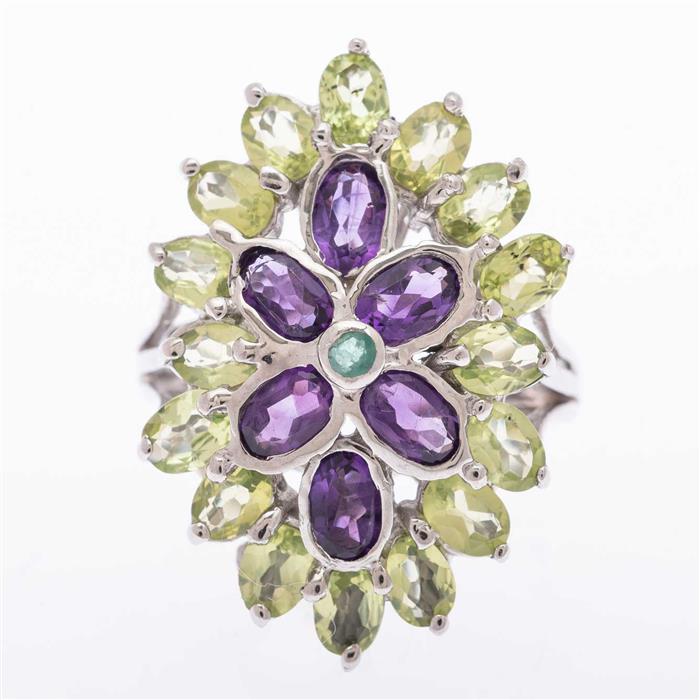Anillo con esmeralda, amatista y peridotos en plata .925.