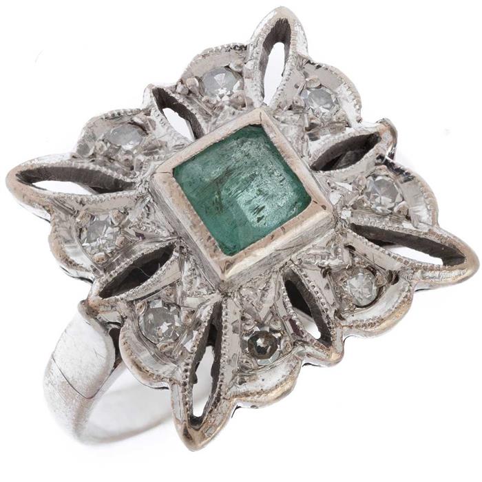 Subasta 1228T, Lote # 364 Anillo con esmeralda y diamantes en plata paladio. 1 esmeralda corte cojín. 8 diamantes corte 8 x 8. Talla: 5 1/2. Peso: 3.7 g. Estimado $1,800-2,500