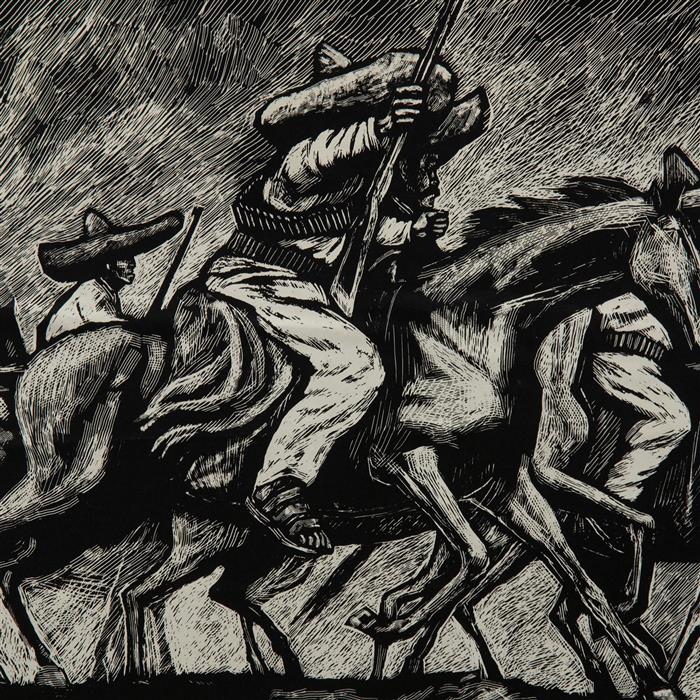 Subasta 1228T, Lote # 314 LEOPOLDO MÉNDEZ (Ciudad de México, 1902 - 1969) Revolucionarios a caballo Grabado sin número de tiraje 50 x 90 cm Estimado $8,000-12,000