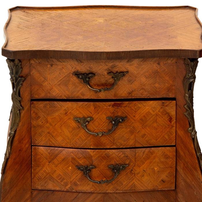 Cuenta con tres cajones y repisa inferior. Con soportes tipo cabriolé