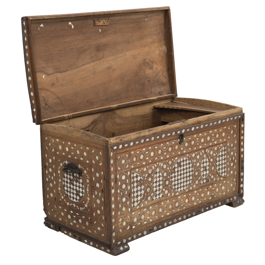 Elaborado en madera enchapada con marquetería e incrustaciones de madreperla