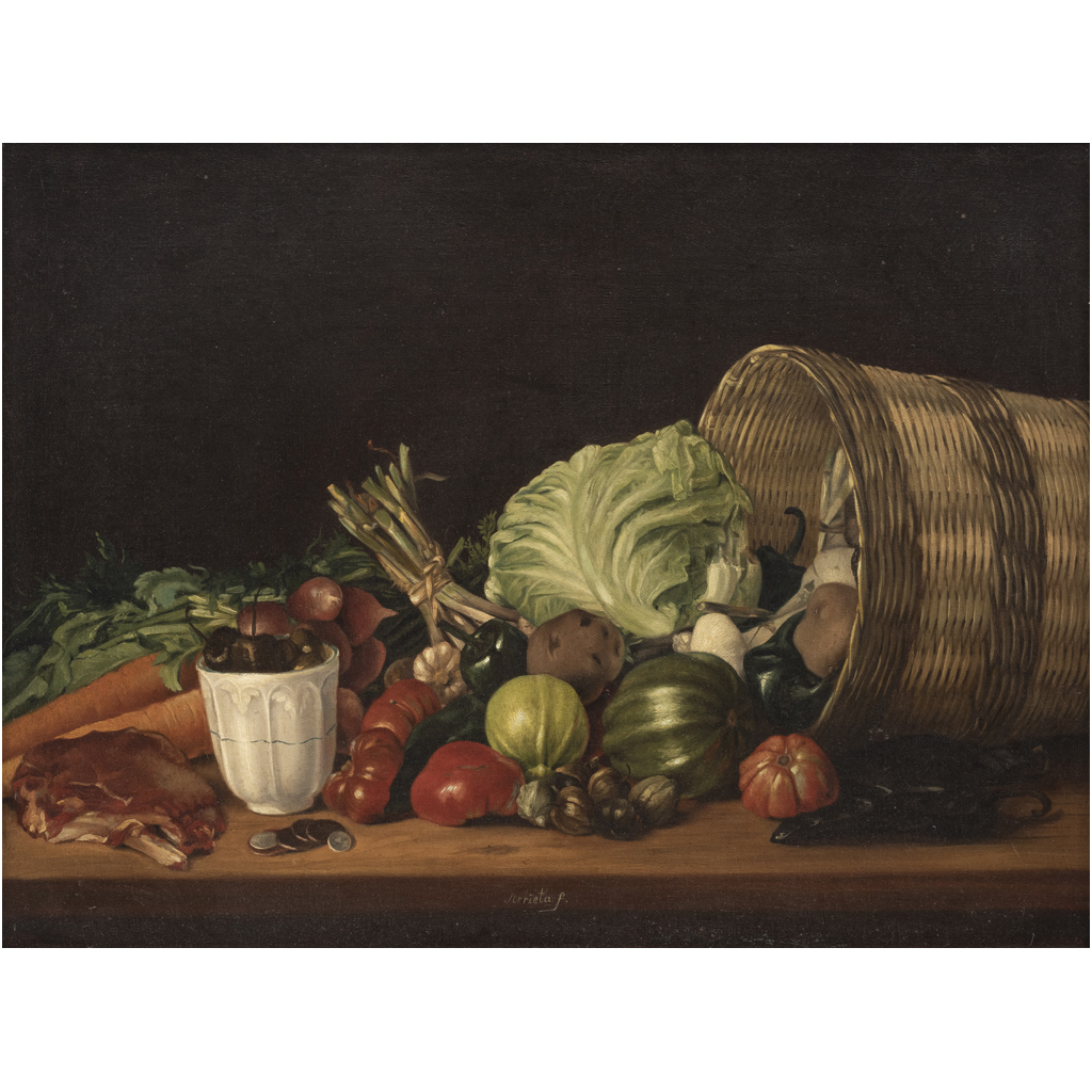 Subasta 1159, Lote # 161 JOSÉ AGUSTÍN ARRIETA (MÉXICO, 1803-1874) BODEGÓN Óleo sobre tela Firmado al frente "Arrieta f." Detalles de conservación y restauración 47 x 63 cm Vendido por Christie's Nueva York en 2003 José Agustín Arrieta, dedicaría toda su vida artística a retratar escenas cotidianas de la Puebla decimonónica, ciudad en la que desarrollaría su formación artística como alumno de importantes artistas locales entre los que se encontraban Lorenzo Zendejas y los hermanos Caro, por mencionar algunos. Su obra destacaría por un claro distanciamiento de las temáticas académicas estereotípicas en favor de representaciones de motivos populares, lo que podemos constatar a través de su predilección por la elaboración de bodegones repletos de enseres indispensables en toda cocina poblana del periodo, formato desdeñado por la Academia y que Arrieta se encargaría de retomar hasta volverlo un modelo icónico de su obra y esencial del costumbrismo. Dentro de las notas que el artista Bernardo Olivares Iriarte escribió en su texto "Álbum artístico" de 1855, con motivo de la muerte de José Agustín Arrieta, el artista poblano señalaba que uno de los géneros en que Arrieta se había desempeñado con suma facilidad era el llamado de "alacenas": "estas obras se componen de la reproducción de todo género de objetos, piezas de cristal, porcelana, objetos de bronce, frutas, flores, recaudo de cocina, legumbres, peces, aves, todo combinado y reunido las piezas que entre sí concuerden, ha hecho composiciones de bastante mérito por la verdad y completa ilusión que les ha dado. Este género de obras todos han convenido que hasta la presente no ha tenido rival en esta ciudad." Como afirma Olivares, Arrieta no debió tener quien pudiera igualarlo en la ejecución de "alacenas", "bodegones" o "naturalezas muertas" en Puebla. A partir del registro con el que hoy se cuenta de la obra del pintor, puede afirmarse que si bien trabajó todos los géneros de la pintura, sin duda éste fue el más abundante en su producción y de ello, podríamos deducir, el más solicitado por los coleccionistas poblanos para la decoración de sus comedores, en donde las pinturas tenían la función de despertar el apetito con la "verdad y completa ilusión" de los frutos, vegetales, alimentos preparados o por preparar; pero también con la exhibición de los utensilios en los que se elaboraban o servían. Tanto los productos comestibles como los enseres para su preparación en la cocina y servicio en la mesa, muestran el sincretismo cultural que caracteriza a la gastronomía poblana. Fuentes: Guadarrama, Angélica Velázquez. José Agustín Arrieta, Museo Amparo, https:// museoamparo.com/colecciones/pieza/1839/sin-titulo-cabeza-de-venado-cuadro-de-comedor (consultado en mayo de 2024). Olivares Iriarte, Bernardo. Álbum artístico 1874. Edición, estudio preliminar y notas de Efraín Castro Morales. México: Gobierno del Estado de Puebla-Secretaría de Cultura, 1987. Página 54. Estimado $1,200,000-2,000,000