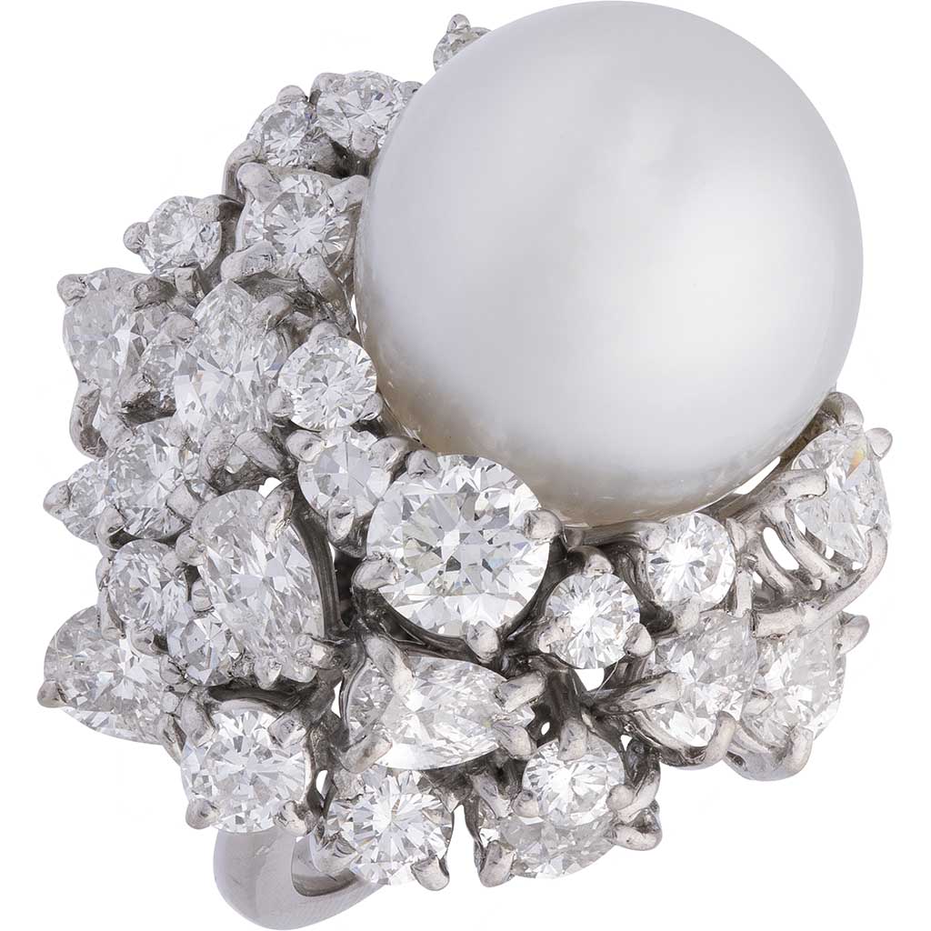 Subasta 1158, Lote # 176 ANILLO CON PERLA Y DIAMANTES EN ORO BLANCO DE 14K Peso: 8.1 g. Talla: 6 1/2 1 Perla cultivada anillada color blanco: 11.3 x 13.5 mm aprox. Diamantes corte brillante y pera ~2.20 ct Estimado $23,000-25,000