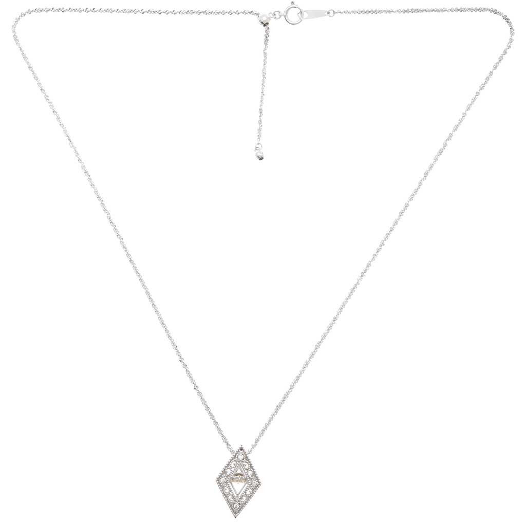 Gargantilla con broche de reasa. Largo ajustable hasta: 46.0 cm aprox. Pendiente con pasa cadena integrado. Tamaño: 2.0 x 1.2 cm aprox. Peso total: 4.7 g 1 Diamante corte brillante ~0.20 ct Claridad: I2-I3 Color: M-N Diamantes corte brillante ~0.04 ct