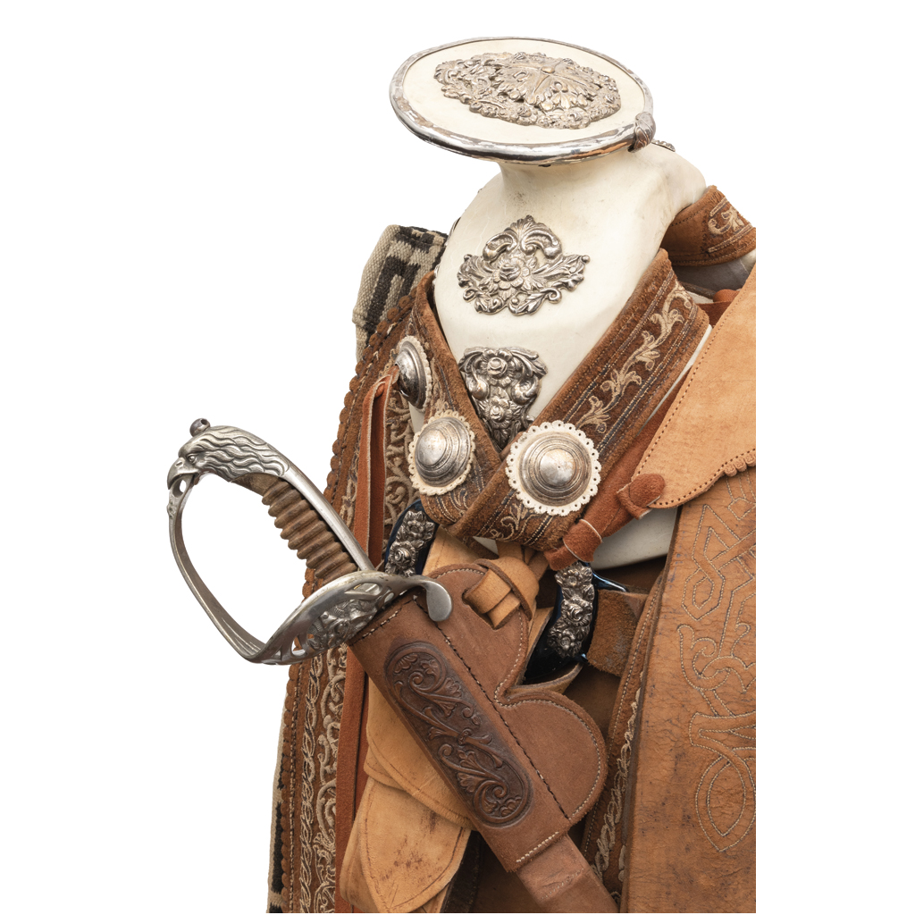 Incluye juego de mantilla, sarape, cuarta y cincho en tonos negro y hueso