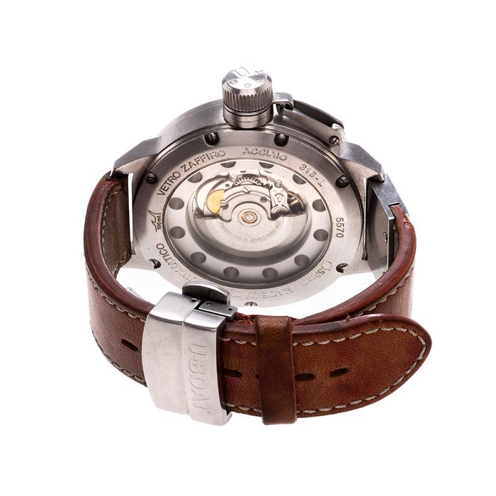 Reloj U-BOAT. movimiento automático. Caja circular en acero de 52 mm. Carátula color negro con índices de barras y números arábigos. Correa de piel color miel. Estimado $14,000-20,000