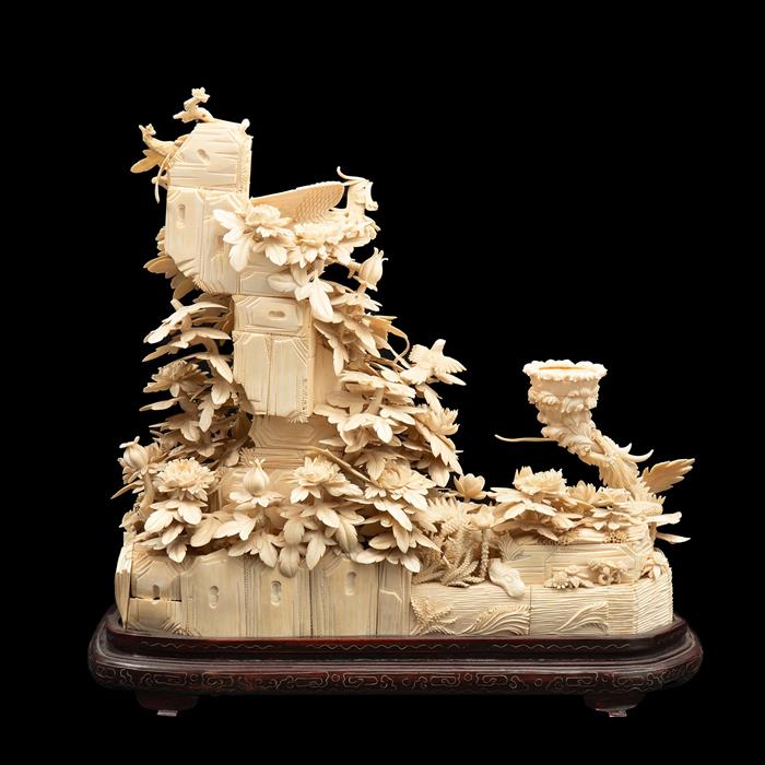 Talla en marfil y emplacado; base de madera