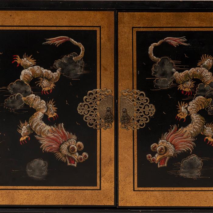 Cuenta con par de puertas abatibles con diseño de dragones y cubierta rectangular