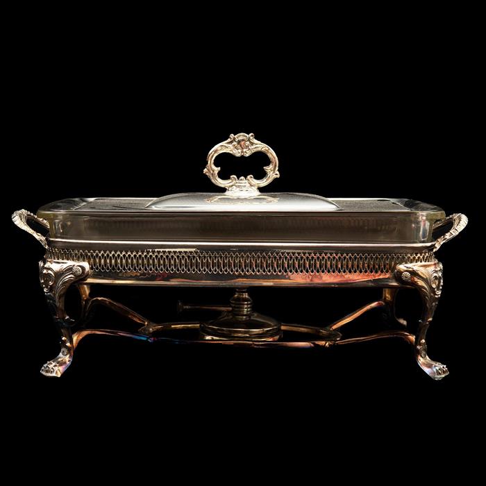 Metal plateado, soportes a manera de garra, relieves de acantos y borde calado; cuentan con refractario de vidrio transparente, tapa y quemador