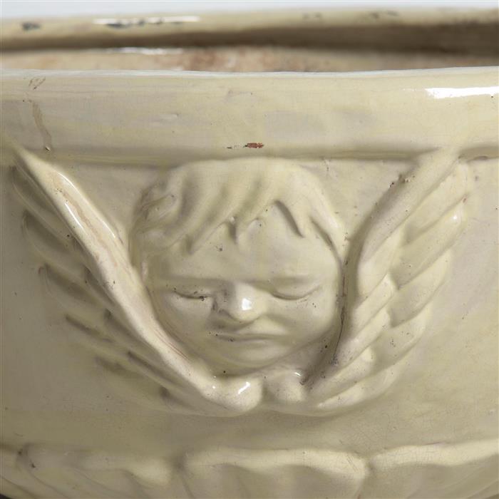 MACETA ITALIA SIGLO XX Elaborada en cerámica color blanco Decorada con amorcillo y detalles florales en relieve Acabado vidriado 30 cm de altura y 69 cm de diámetro Detalles de conservación Estimado $2,800-5,000