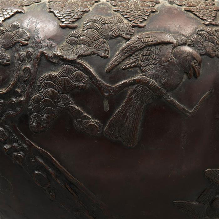 Bronce, patinado en color marrón; decorado con relieves a manera de aves en enramada y representación de deidad con dragones; se incluye una base de bronce dorado con relieves de águilas y figuras florales (matrimonio)
