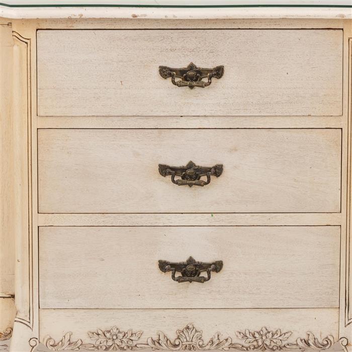 Cuenta con cubierta irregular, dos pares de puertas abatibles, 4 cajones y soportes tipo cabriolé
