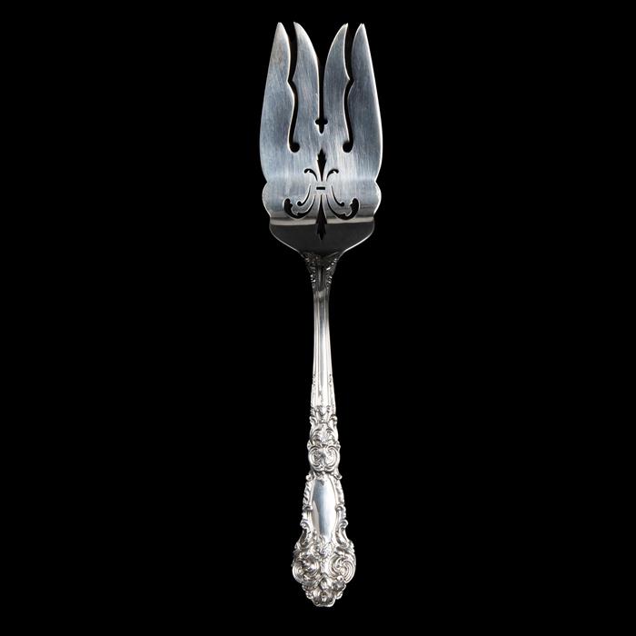 Subasta 1248T, Lote # 367 JUEGO DE CUBIERTOS ESTADOS UNIDOS DE AMÉRICA, SIGLO XX Plata REED & BARTON Sterling, hojas y puntas de acero; decoración con diseños de acantos Consta de: 4 cuchillos para carne, 7 cuchillos medianos, 9 cuchillos para mantequilla, 7 tenedores para carne, 4 tenedores medianos, 11 tenedores para pescado, 10 tenedores para mariscos, 6 cucharas soperas, 20 cucharas medianas, 6 cucharas cafeteras, 8 cubiertos de servicio Ligeros detalles de conservación Peso total: 4301 g aproximadamente Piezas: 92 Estimado $35,000-70,000