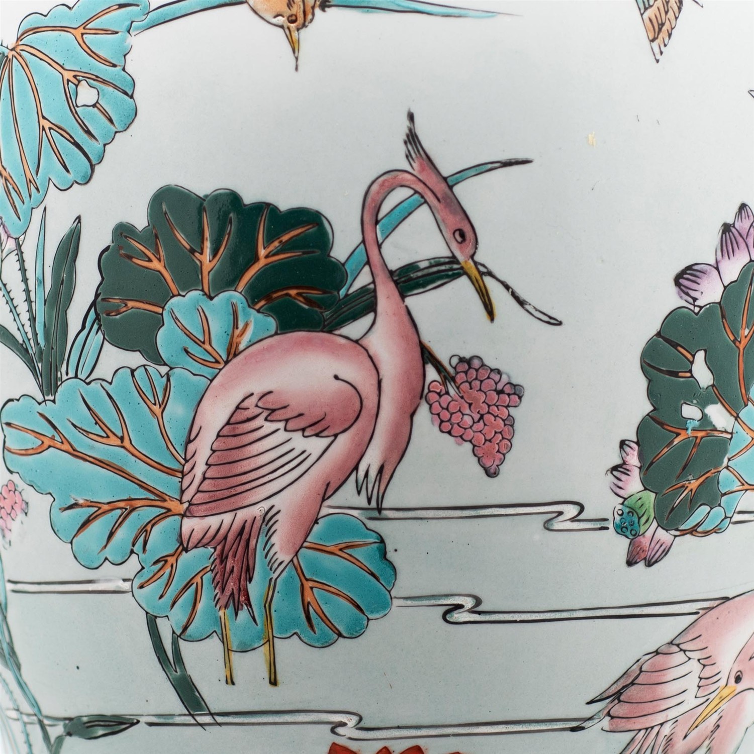 JARRÓN ORIGEN ORIENTAL SIGLO XX Elaborado en porcelana policromada Diseño orgánico Decoración con garzas, motivos florales y naturales Detalles de conservación y marcas de uso 64 cm de altura Estimado $1,500-3,000