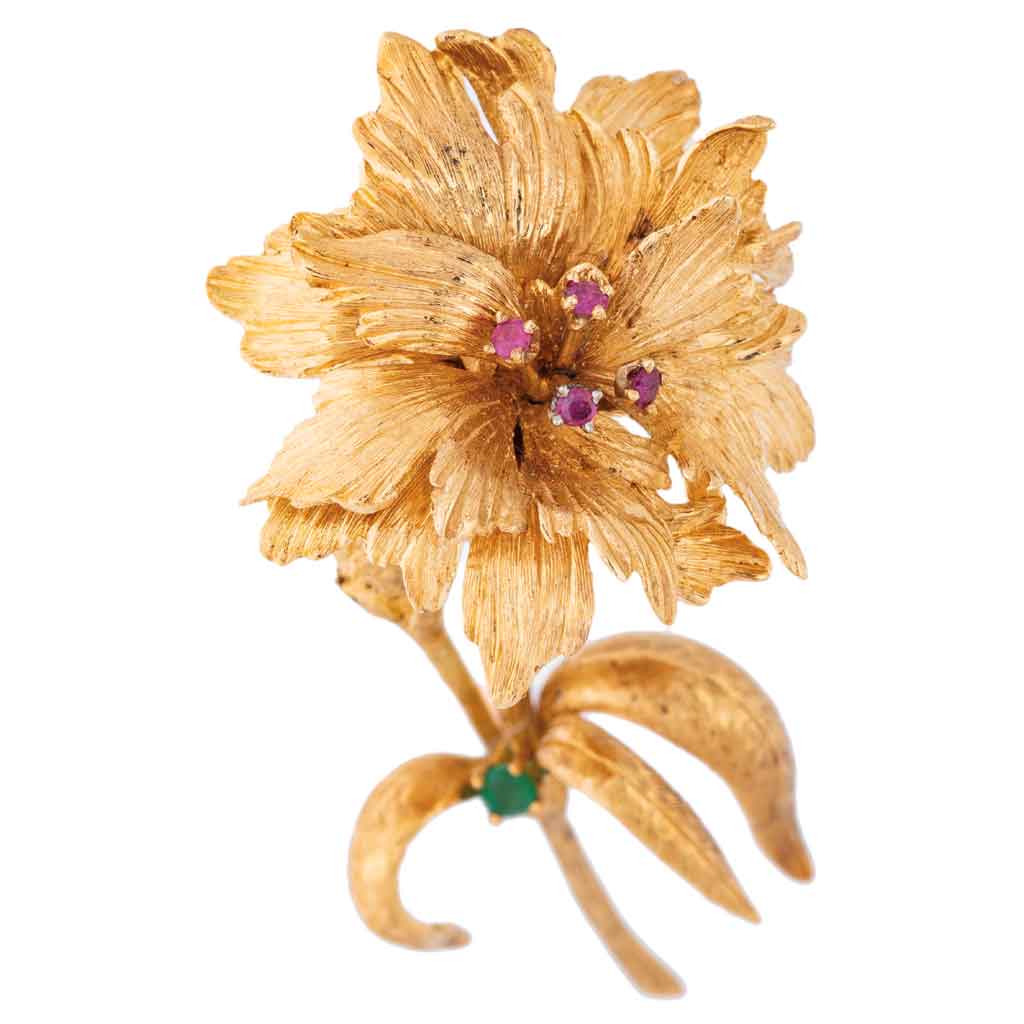 Subasta 1203, Lote # 81 PRENDEDOR CON SIMULANTES EN ORO AMARILLO DE 18K Alfiler y seguro. Peso: 18.4 g. Tamaño: 2.8 x 6.0 cm aprox. Estimado $25,000-30,000