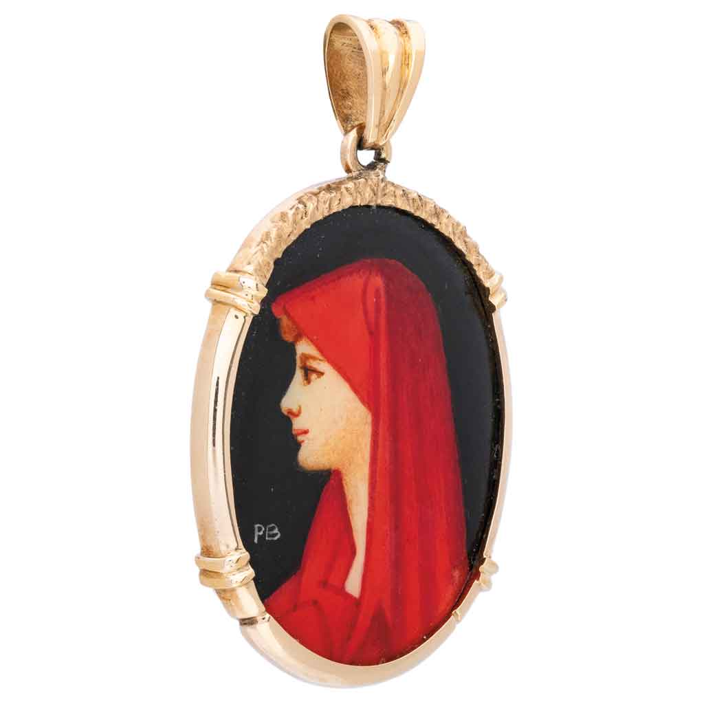 Subasta 1203, Lote # 99 PENDIENTE CON ESMALTE EN ORO AMARILLO DE 14K Con perfil de dama en esmalte. Pasa cadena articulado. Peso: 7.8 g. Tamaño: 4.4 x 2.7 cm aprox. Estimado $6,000-7,000