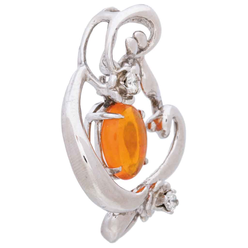 Subasta 1203, Lote # 2 PENDIENTE CON ÓPALO Y DIAMANTES EN ORO BLANCO DE 18K Pasa cadena integrado. Peso: 7.7 g. Tamaño: 3.2 x 2.2 cm aprox. Ópalo corte cabujón ~1.75 ct Diamantes corte brillante ~0.13 ct Estimado $10,000-11,000