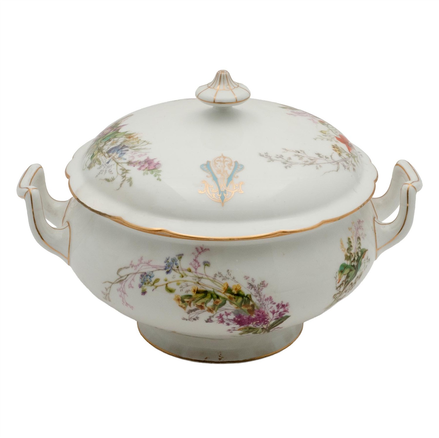 Decorada con elementos florales en tonoz azules y lilas con filo de esmalte dorado