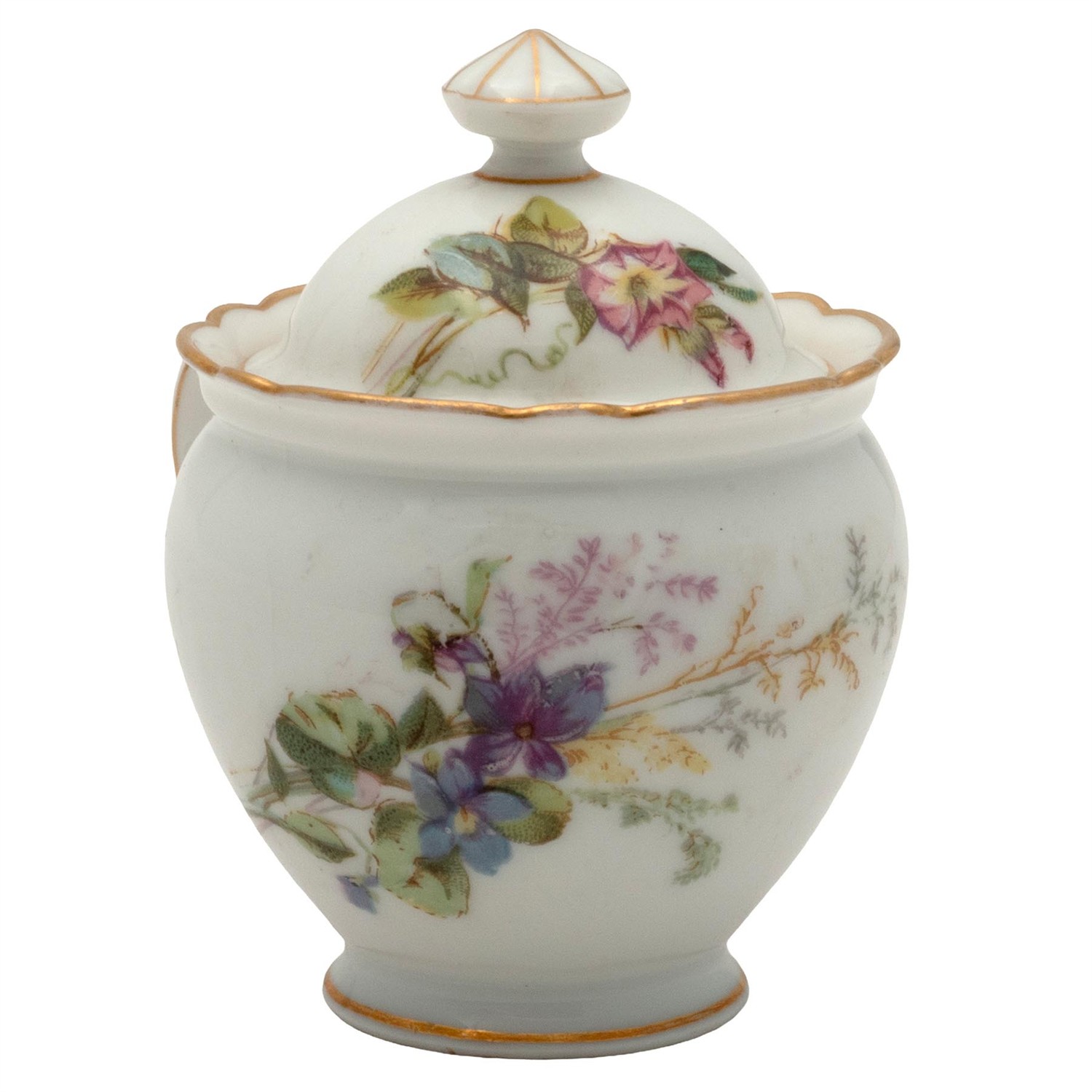 Decorada con elementos florales en tonoz azules y lilas con filo de esmalte dorado