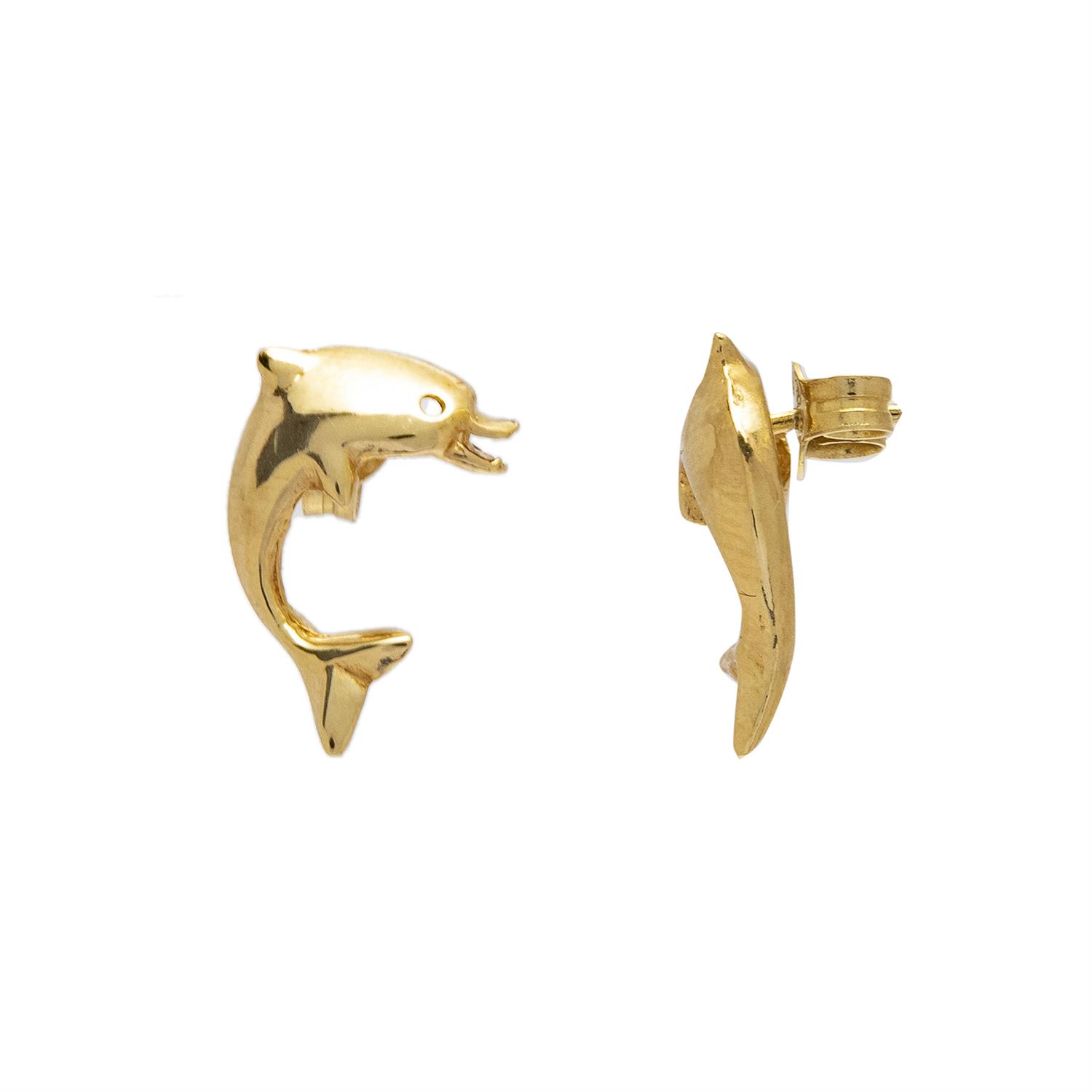 Subasta 1297T, Lote # 250 PAR DE ARETES "DELFINES" EN ORO AMARILLO DE 14K Poste y contra. Tamaño: 1.8 cm x 1.2 cm aprox. Peso: 2.6 g. Estimado $1,900-2,500