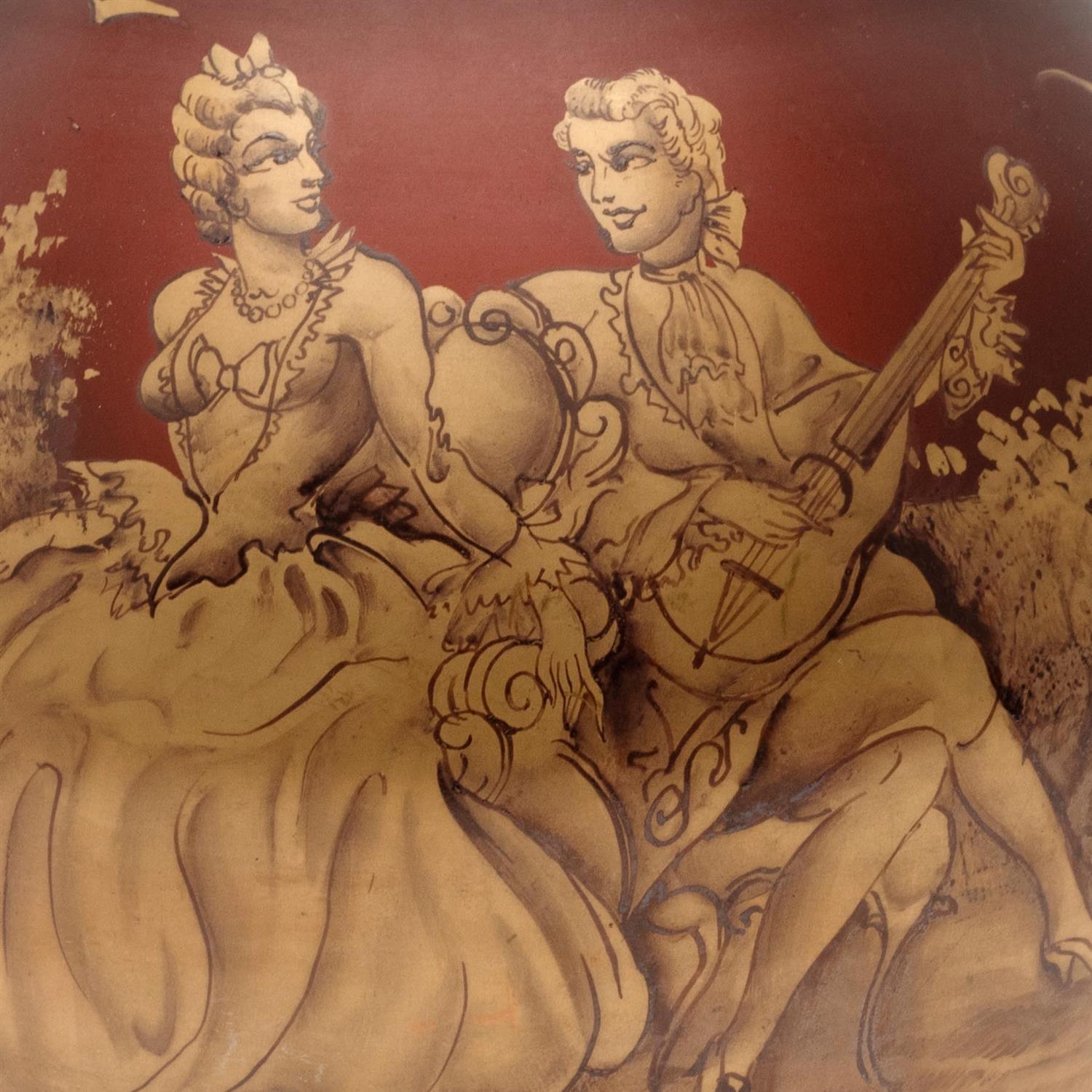 LICORERA CHECOSLOVAQUIA SIGLO XX Elaborada en cristal color ambar Decorado con escena galante en esmalte dorado 30 cm altura Detalles de conservación Estimado $1,800-3,000