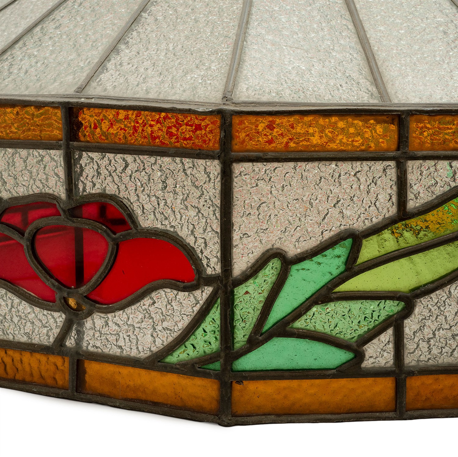 PANTALLA PARA LÁMPARA DE TECHO SIGLO XX Tipo Tiffany Elaborada en vidrio transparente emplomado Diseño decagonal y soporte para techo con cadena Decorado con motivos florales y geométricos Marcas de uso y detalles de conservación 28 cm de altura Estimado $1,800-4,000
