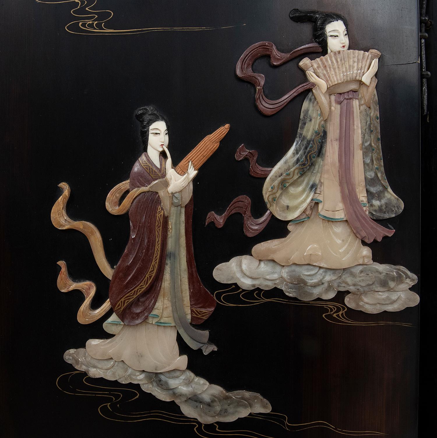 4 hojas, incrustaciones de piedra jabonosa y madre perla; soportes lisos con casquillos de metal