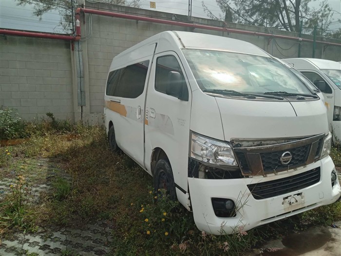 Subasta 55COPP, Lote # 15 Eco. U50802; Camioneta de pasajeros, Urvan; Marca: Nissan; Modelo: 2014; Serie: JN1BE6DS2E9002931; Ubicación: Tecamac ; Observaciones: Unidad sin prueba de arranque, por lo que no se garantiza su funcionamiento, sin llave, sin batería, transmisión sin probar, interiores maltratados, vestiduras rotas, chasis con corrosión, carrocería con golpes ligeros, corrosión exc esiva, fascia y parrilla dañadas, cajuela dañada, ventana trasera lado izquierdo rota, llantas lisas y dañadas. Numero de motor no visible por corrosion.; Estimado $84,000