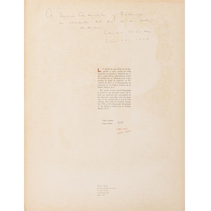 fo. marquilla, litografías 42 x 31 cm., firmadas en plancha. Edición de 1,000 ejemplares numerados y firmados por el autor; ejemplar 591, firmado. Dedicado y firmado por Carlos Mérida: "A María Antonieta y Federico en recuerdo del día de su boda, dedica Carlos Mérida, Junio 19, 1954". Cada lámina con texto explicativo, bilingüe (español e inglés) en papel albanene. Incluye tarjeta manuscrita. Pequeñas manchas de humedad en pastas. En Carpeta.