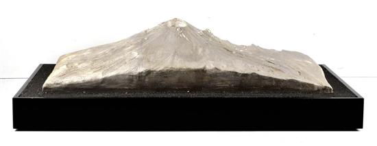 Subasta 612, Lote # 120 JORGE OBREGÓN Don Goyo, Popocatépetl Firmada y fechada 2011. Escultura en bronce a la cera perdida con baño de plata sobre ceniza volcánica 3 / 20 Con certificado de autenticidad del artista, septiembre de 2011. Publicada en: "Jorge Obregón. México y los Picos de Europa dominios de roca y volcanes." México. Museo de Arte Moderno del Estado de México, 2011. Pág. 45. (N. Ciudad de México, 1972 - ) Trashumante, Jorge Obregón se halla lejos de aquel romanticismo del siglo XIX, sus panoramas fuertemente intelectualizados y ambiciosamente concebidos, van a la vez preñados de emotividad. Él está cierto que un paisaje no se realiza a fuerza de pinceladas, sino a fuerza de medidas y de formas estilizadas. En sus vistas no hay nada dejado al azar, las estructuras están solidamente arregladas; las integra gracias a un cálculo esmerado, ya que todo va marcado con exactitud. Véase: Elisa García Barragán Martínez. "Jorge Obregón. Los Horizontes de la Tierra." 44 x 77 x 18 cm Estimado $55,000-65,000