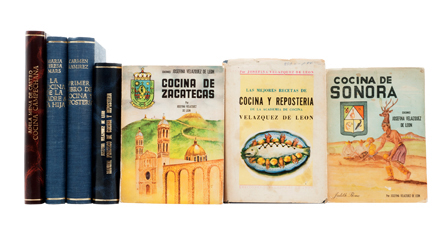 Subasta 714, Lote # 136 CO - Velázquez de León, Josefina / Mars, María Teresa / Mena de Castro, Adela / Ramírez, Carmen. Las Mejores Recetas / Cocina de Sonora / Cocina de Zacatecas / Manual Práctico / La Cocina / Cocina Campechana / Primer Libro de Cocina. a) Velázquez de León, Josefina. Las Mejores Recetas de Cocina y Repostería. México: Ediciones J. Velázquez de León, sin año. 8o. marquilla, 275 p. Con 16 láminas a color. Lomo y pastas gastados. Encuadernado en pasta dura. b) Velázquez de León, Josefina. Cocina de Sonora. México: Ediciones Josefina Velázquez de León, 1958. 8o. marquilla, 160 p. + 3 h. Primera edición. Lomo y pastas gastados. Encuadernado en rústica. c) Velázquez de León, Josefina. Cocina de Zacatecas. México: Ediciones Josefina Velázquez de León, sin año. 8o. marquilla, 127 p. + 3 h. Lomo y pastas gastados. Encuadernado en rústica. d) Velázquez de León, Josefina. Manual Práctico de Cocina y Repostería. México: Velázquez de León, Josefina, 1943. 8o. marquilla, 597 p. Conserva pastas originales en rústica. Encuadernado en pasta dura, en piel. e) Mars, María Teresa. La Cocina de la Madre a la Hija. México: Imprenta Barrie, 1944. 4o. marquilla, 333 p. Lomo y pastas gastados. Encuadernado en pasta dura. f) Mena de Castro, Adela. Cocina Campechana. Mérida, Yucatán: Editorial "Zamna", 1969. 4o. marquilla, XII + 371 p. Conserva pastas originales en rústica. Encuadernado en pasta dura, en piel. g) Ramírez, Carmen. Primer Libro de Cocina y Repostería. México: Editorial Stylo, 1950. 4o. marquilla, 404 p. Con láminas intercaladas a color. Manchas de humedad. Encuadernado en pasta dura. Total de piezas: 7. Estimado $6,000-8,000