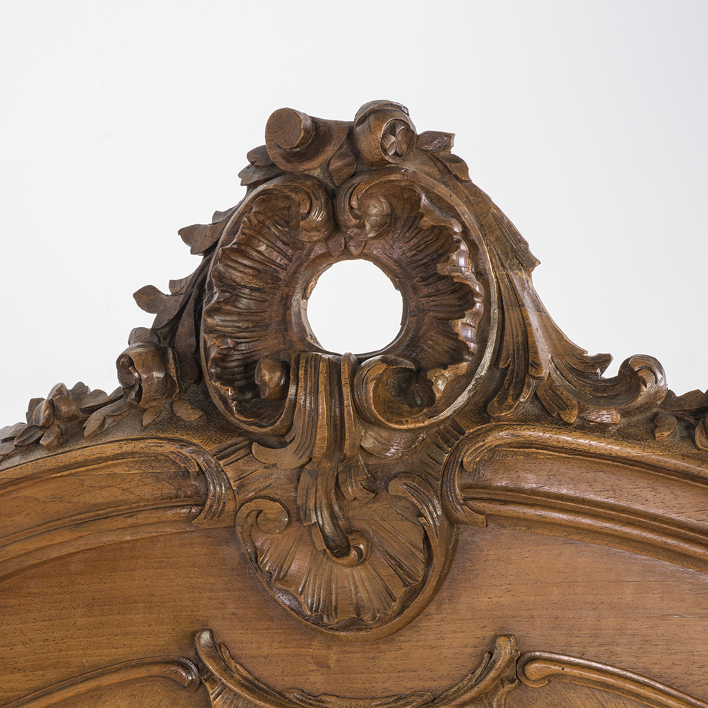 Cama matrimonial. Francia. Siglo XX. Estilo Luis XV. Elaborada en madera tallada de nogal. Decorada con remate a manera de rocalla, canastón, veneras, acantos y motivos florales. Presenta detalles de conservación, de estructura, fisuras, faltantes, marcas y desgaste. *Medidas estándar europeas*. Estimado $ 4,000-6,000