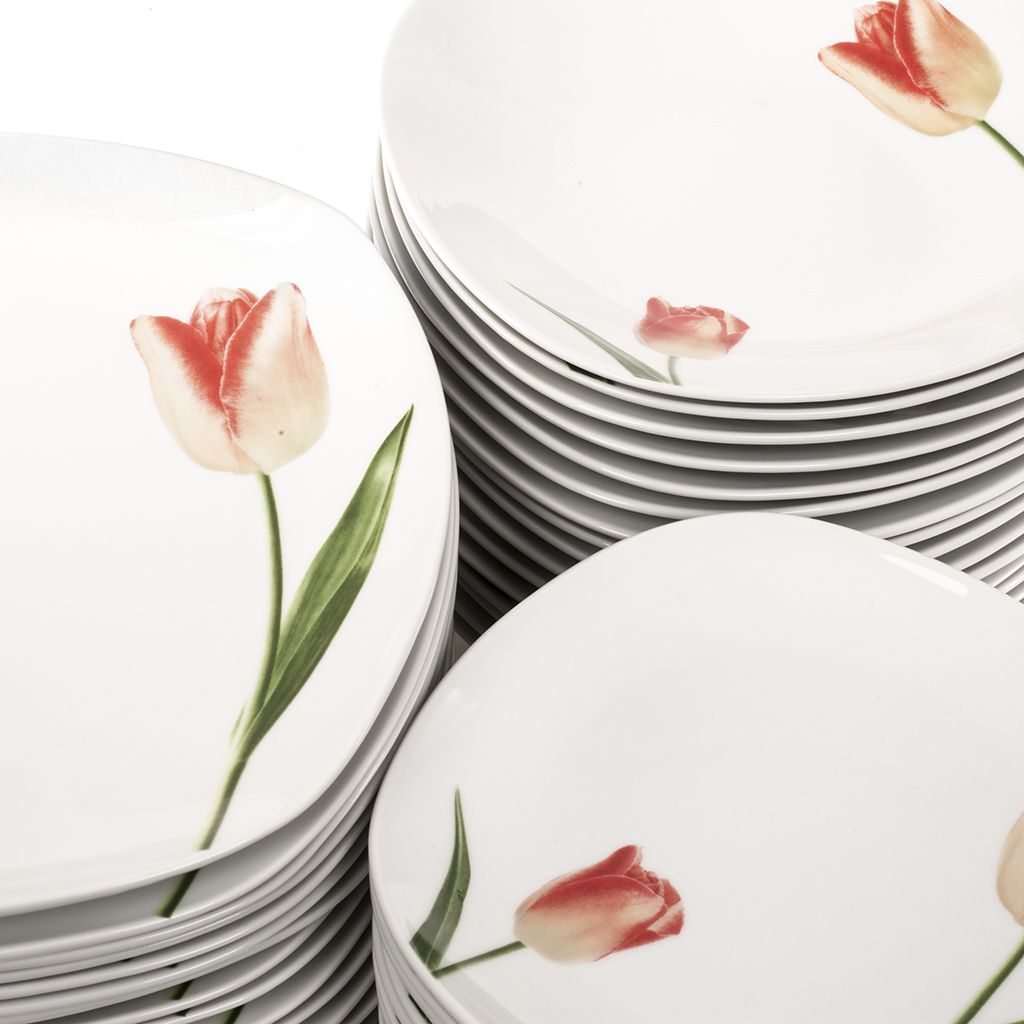 Consta de: 16 platos trinche, 16 platos para sopa, 16 platos para ensalada y 16 tazas con 16 platos base.