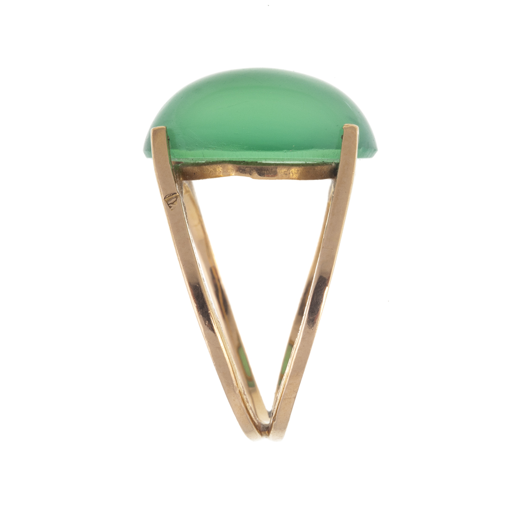 Diseño con 2 anillos abiertos, unidos por una base oval sosteniendo cabujón de jadeíta.