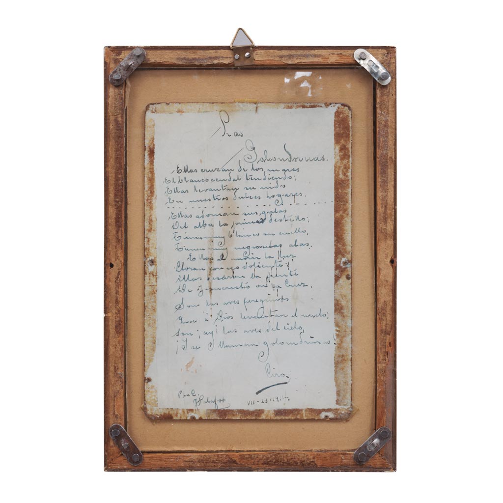 Óleo sobre cartón. Firmado: "I. Marañón". Cuenta con un poema manuscrito al reverso, de Antonio F. Grilo, llamado "Las Golondrinas". Fragmento: "Ellas cruzan los mares / el blanco cendal tendiendo; / Ellas levantan su nido / en nuestros dulces hogares / Ellas adornan sus alas / del Alba el primer destello...". El poema está firmado: "Ciro VII-23-1914 / Paul Hadafot (?)".